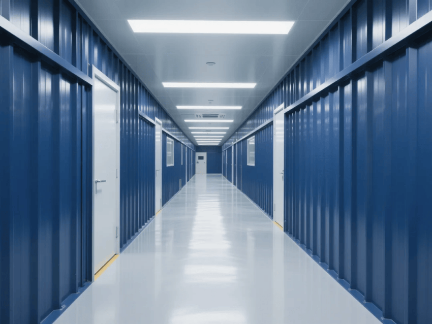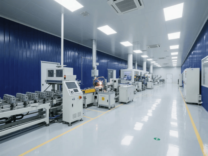 车间采用??榛嗑皇医峁?,墙体采用50mm厚深蓝抗菌彩钢板,接缝处采用圆弧处理工艺。自动化冲压线与激光焊接工作站呈U型交替布局,工作站间设置深灰不锈钢传递窗,确保物料流转洁净度。吊顶系统配置FFU高效过滤单元,维持≥20次/h换气次数,气流组织采用顶送侧回模式。