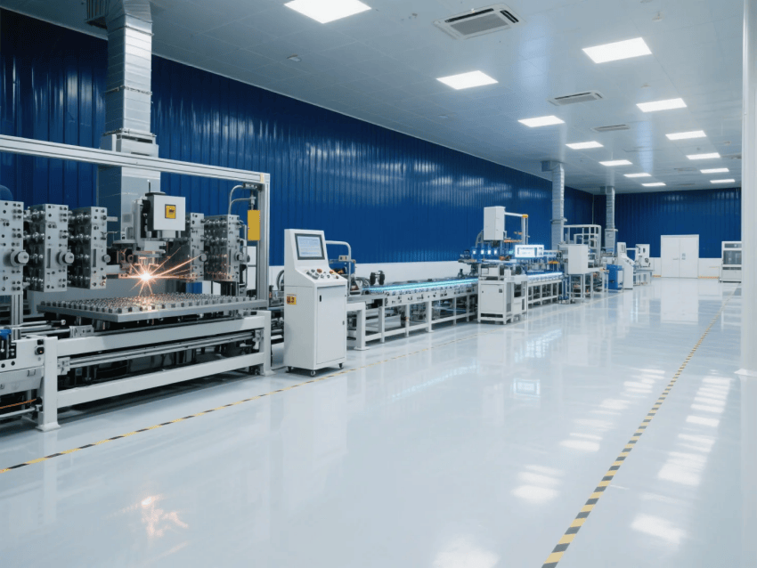 智能控制系统集成环境监测、设备联动和MES数据看板,深蓝墙面上嵌装LED智能显示屏,实时反馈生产数据。激光焊接区配备黄光防眩照明,工作站外围设置浅灰环氧树脂警示带。整体设计通过冷色调的科技美学与自动化产线的有机结合,构建高效可靠的光伏材料智能制造空间。