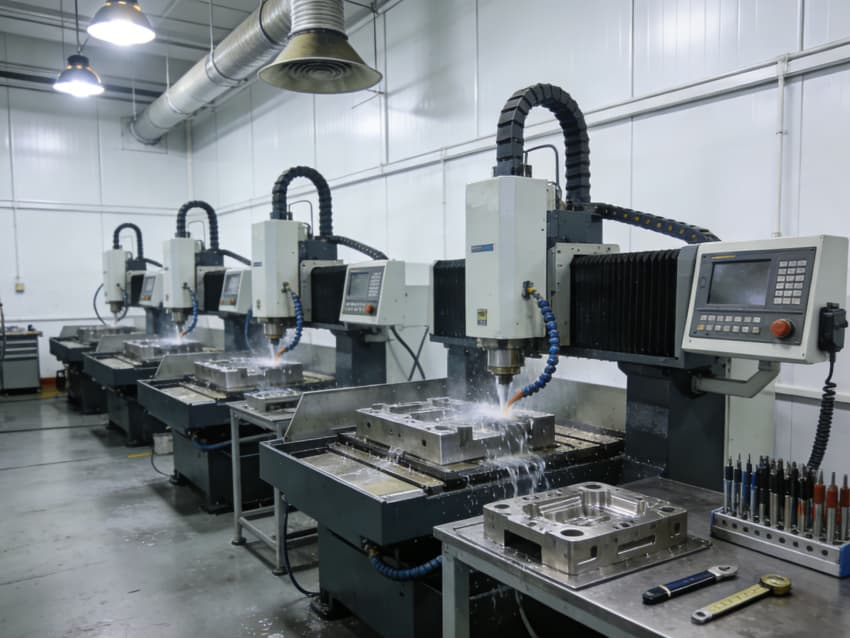 白色墙面采用工业级洁净涂层,无缝拼接搭配圆弧阴阳角设计,杜绝积尘死角,减少粉尘对模具精度的影响。车间划分加工区、检测区、调试区等功能区域,布局科学合理,加工区增设阻尼减震垫层降低设备振动干扰,检测区预留精密仪器安装位与恒温调控接口,各区域均配备标准化管线预埋与设备固定点位,全方位保障模具制造的精准性与稳定性。