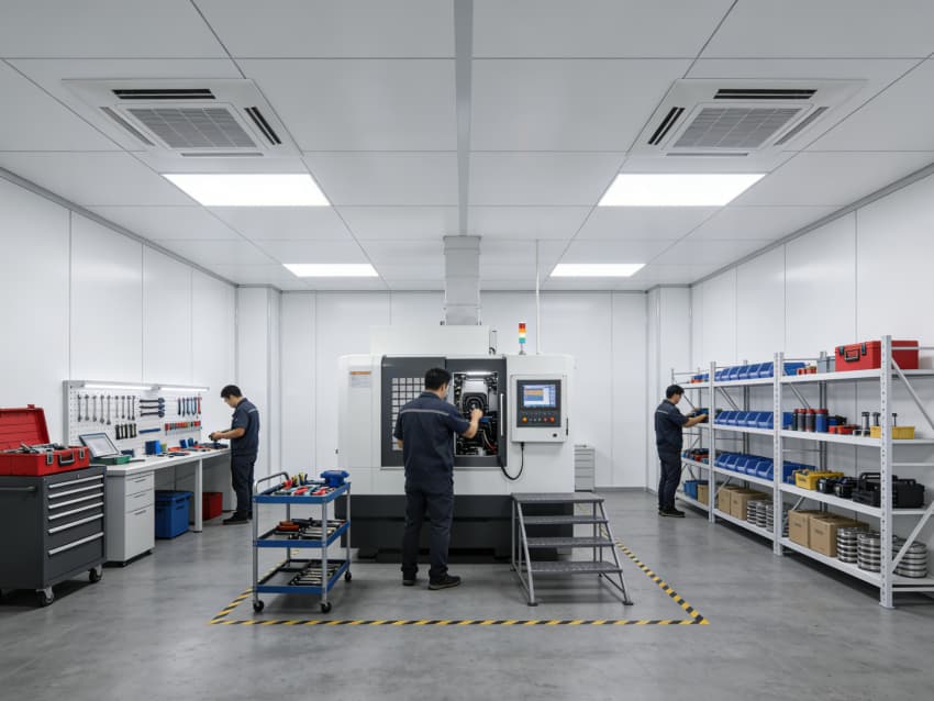 恒温恒湿车间内部采用灰色地面与白色墙壁的简约统一风格,精准匹配高端制造对环境稳定性、洁净度的严苛需求?;疑孛嫜∮媚湍タ咕驳缁费醪闹?,经多道精密施工工序处理,表面平整无接缝,兼具抗油污、易清洁特性,可耐受智能设备高频移动作业。白色墙面采用高洁净抗菌涂层,搭配密封式拼接与圆弧阴阳角设计,杜绝积尘死角,有效降低环境干扰。