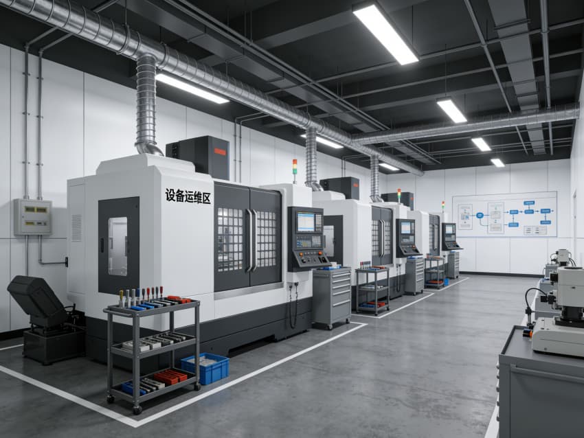 配套的物料仓储区采用重型货架规范存放各类工装夹具与半成品,实现物料的快速调取与流转;“设备运维区” 配备专业维保团队与工具车,定期对 CNC 设备进行校准与养护,确保设备长期处于高精度运行状态。