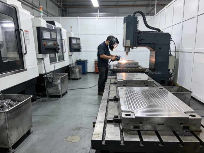 本厂房是一座集精密加工、质量检测、智能仓储与设备运维于一体的现代化生产基地,厂房核心加工区排布着多台进口 CNC 加工中心,采用多轴联动控制系统,可实现复杂曲面、精密孔系的一体化加工,满足微米级精度要求;一旁的特种加工工位上,技术人员正在进行模具表面的精密焊接与打磨,为高难度工装件提供定制化工艺支持。