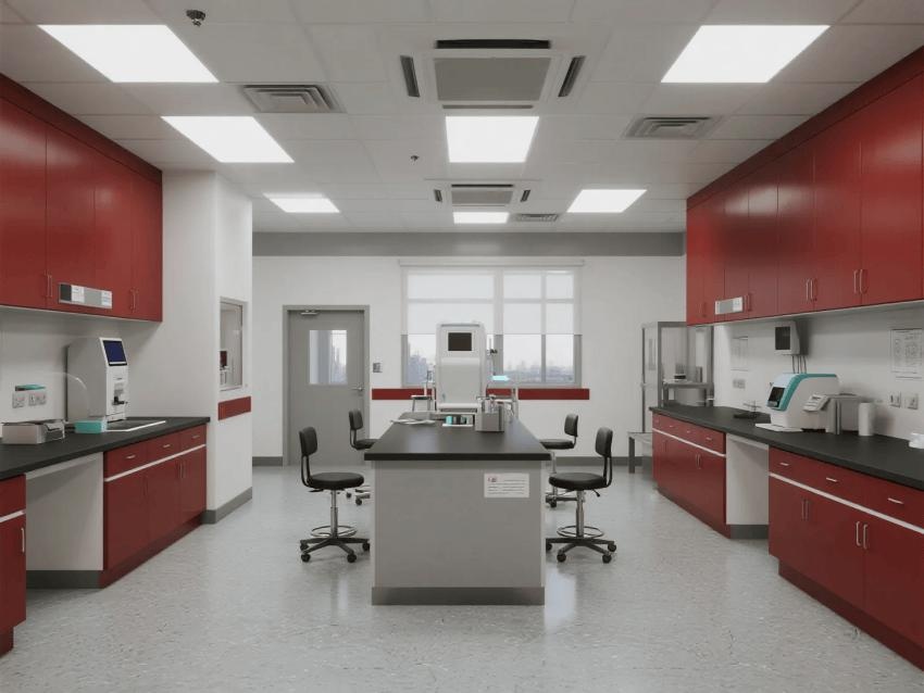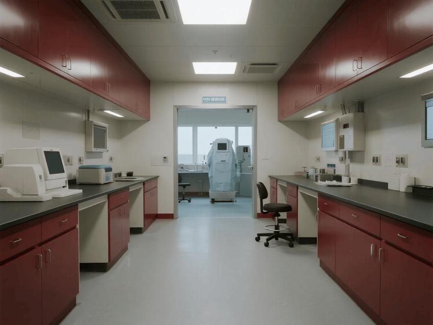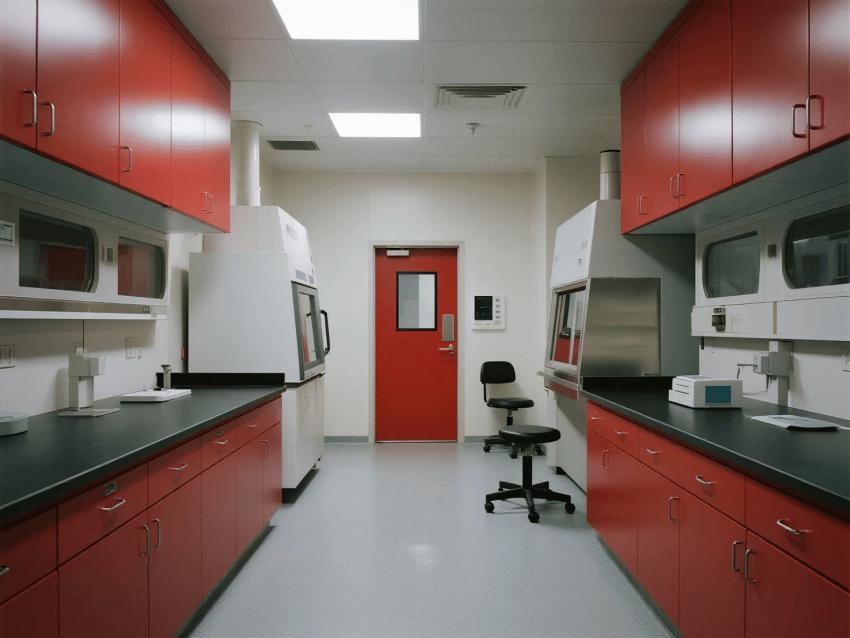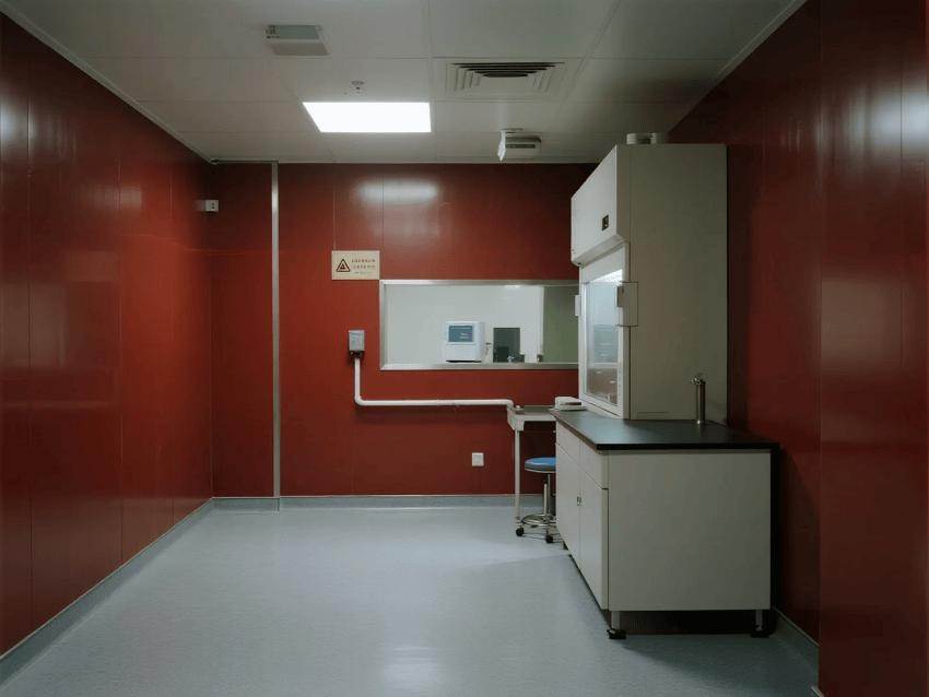 本实验室严格遵循BSL-3级生物安全标准,通过深红彩钢板与浅灰环氧地坪的强烈视觉对比,构建安全高效的病原体研究空间。