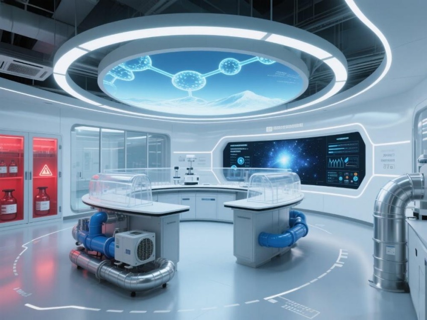本实验室以"绝对环境控制"为核心设计理念,整体采用冰川蓝与钛白灰的渐变配色。墙面嵌入式环境参数监测屏实时流动着翡翠绿数据流,与顶棚矩阵排列的微孔送风口形成科技韵律。核心实验区采用圆弧形防结露玻璃隔断,内置百级洁净层流罩。地面铺设防静电陶瓷钢板,接缝处嵌入LED环境达标指示灯。设备区裸露的银色保温管道与蓝色冷媒管构成工业美学展陈,智能除湿机组通过半透明外壳展示内部冷凝过程。数据中控室配备270°曲面监控屏,悬浮粒子浓度以动态星云图呈现??占渫ü辖鞯募负畏指钣肓魈辶ρ呓岷希诩禄肪晨刂埔笙拢蛟斐黾婢呖蒲醒纤嘈杂胄羌什瘴蠢锤械亩ゼ妒笛榛肪?。