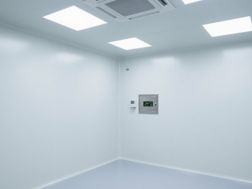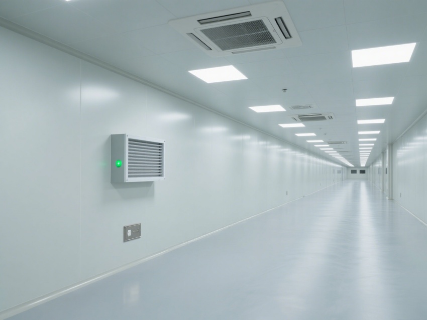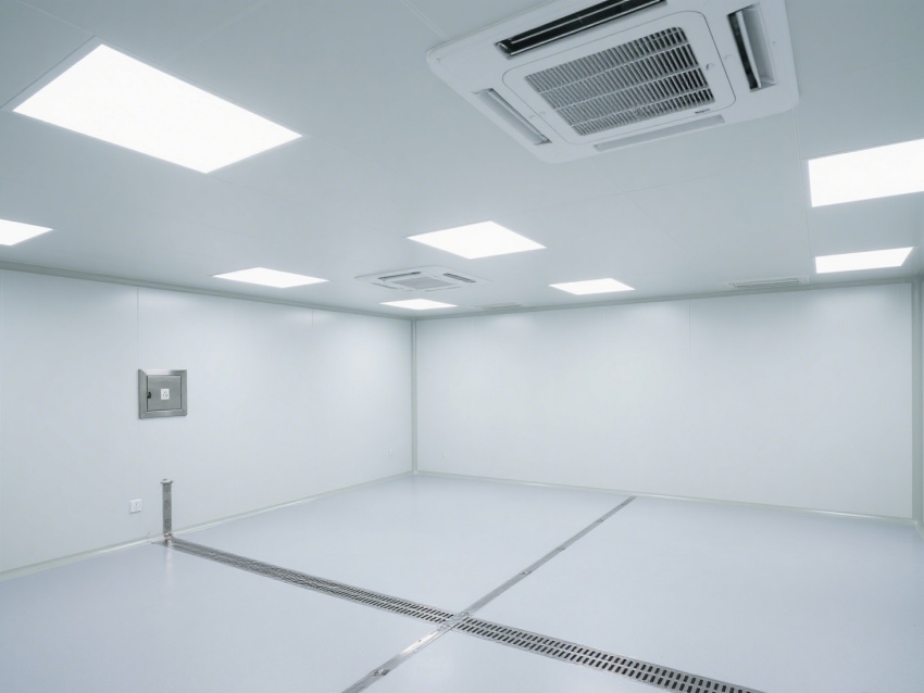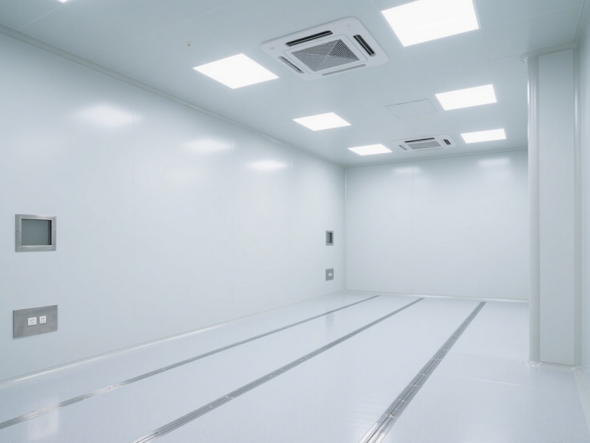 效果图从多视角展现关键设计:正面全景图呈现开阔无设备空间,预留充足布局灵活性;角落特写聚焦墙面与地面无缝拼接工艺、圆弧收边处理,规避积尘死角;侧视图清晰展示顶部十万级高效送风口、回风夹道与压差计,直观传递洁净控制核心;局部细节图则凸显地面防静电环氧涂层的细腻质感,契合电子元件生产防护要求。?