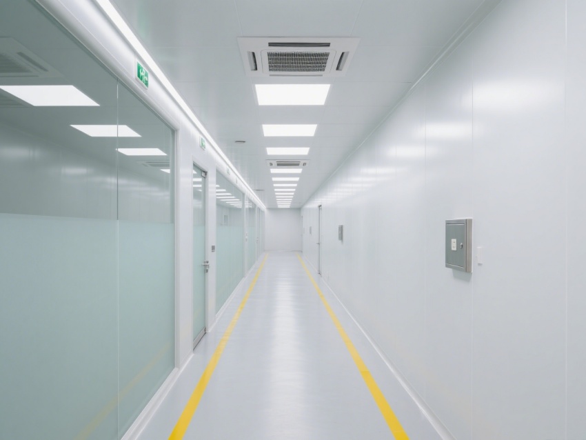 精准还原电子行业洁净空间,白灰主色调贯穿整体,风格简约专业且质感统一。浅白墙面搭配浅灰地面、金属色设备接口线条,既符合电子车间低尘、抗静电的核心需求,又通过色调层次避免空间单调,视觉上凸显洁净通透的特质。?
