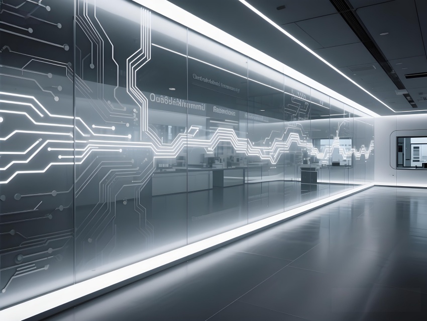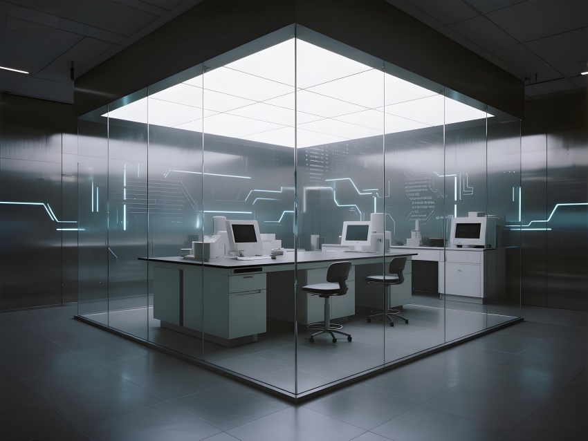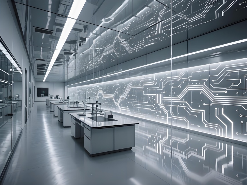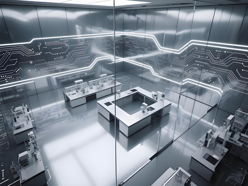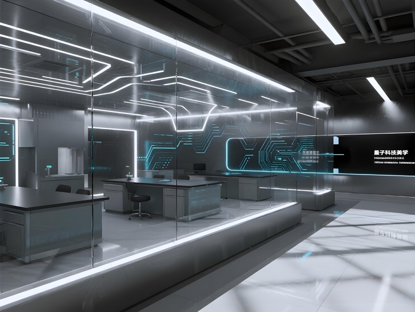 本实验室采用"量子科技美学"设计,将纳米尺度的精密感转化为空间叙事。主实验区以镜面银与深空灰为基调,半透明防辐射玻璃墙体内嵌电路板纹理光带,象征微观世界的电子轨迹。百级洁净区的金色气流箭头与千级区的蓝色光晕形成能级跃迁般的视觉分级,CVD设备舱的蜂窝状散热孔与悬浮式控制面板构成未来工厂意象。地面导光纤维模拟分子结构网络,天花板动态粒子监测屏以数据流形式投射纳米颗粒分布。通过冷调LED与设备荧光的层次照明,在满足EMI屏蔽与化学防护需求的同时,创造出如同操作量子领域的沉浸式科研环境,透明气闸门上的全息警示标志进一步强化尖端材料研究的科技仪式感。