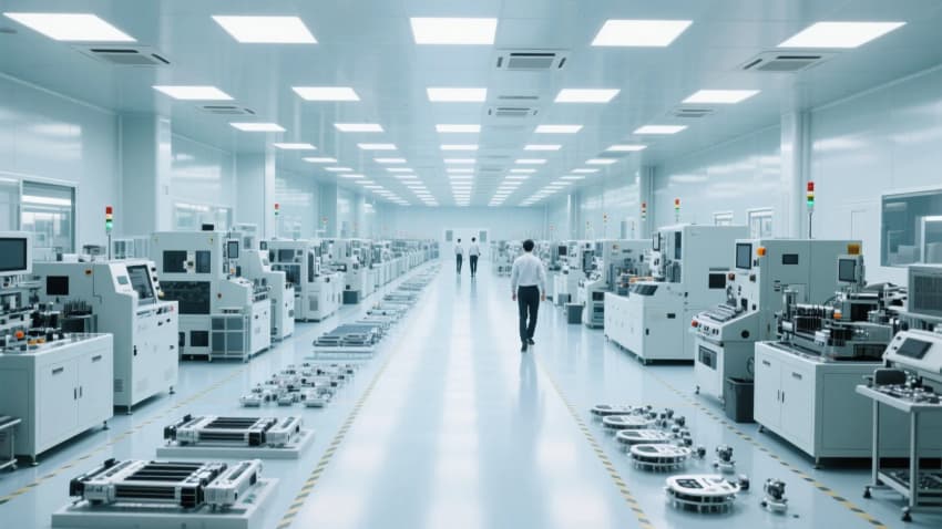 1000平方米电子无尘车间,现代科技风格,干净整洁,光线明亮。核心生产区占70%,辅助区占20%,办公区占10%。核心生产区:防静电环氧地坪(浅灰色),白色彩钢板墙面和天花板,垂