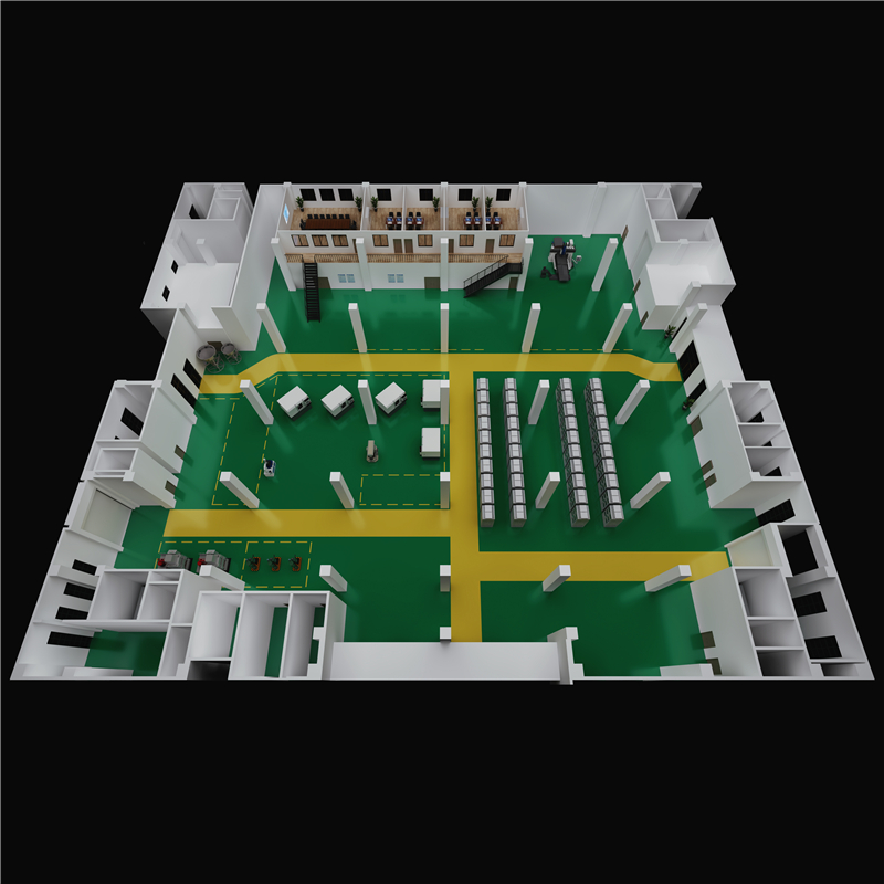 整个车间以白色为主色调,营造出干净、整洁的氛围。地面采用了光滑的白色瓷砖,便于清洁和维护。车间内的门和门框大多是不锈钢材质,显得坚固且易于清洁。 车