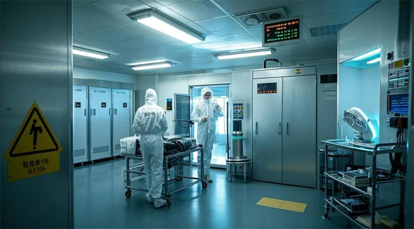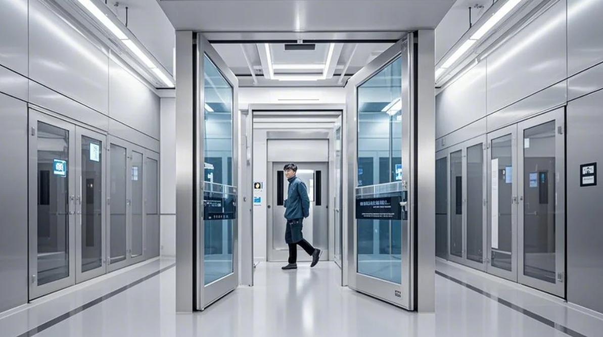 半导体晶圆厂洁净车间,工业级无尘环境设计。更衣区设置环氧树脂自流平地坪,墙面嵌入正压送风百叶,紫外线消毒衣柜线性排列。风淋通道配备360度旋转气流喷嘴,顶部