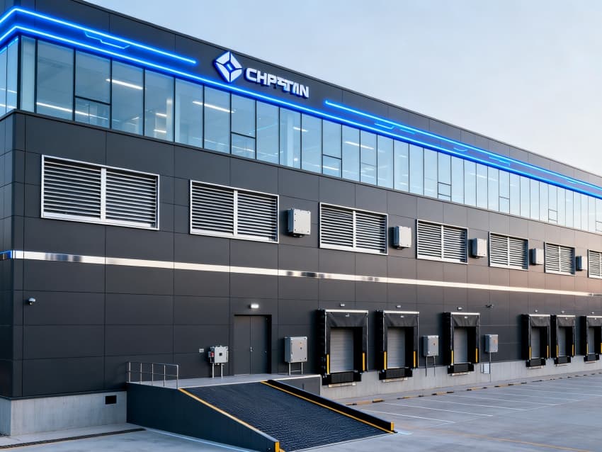 本芯片厂净化工程含1张外立面与6张内部万级净化车间效果图,风格统一适配芯片生产需求。外立面采用银灰色钛锌板与超白Low-E玻璃,兼具抗电磁干扰与高透光性,预留