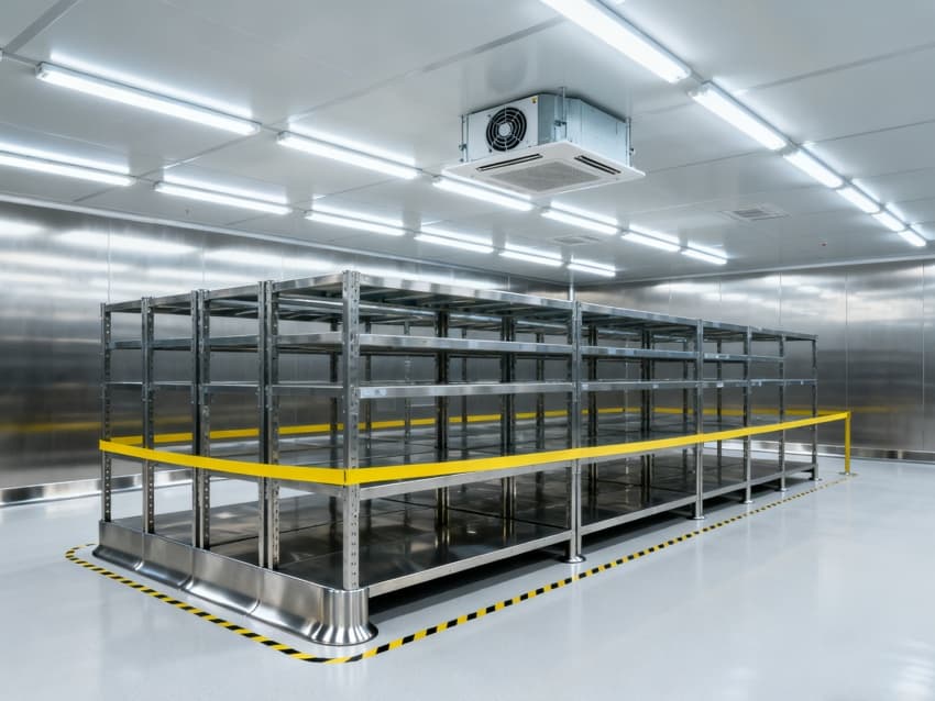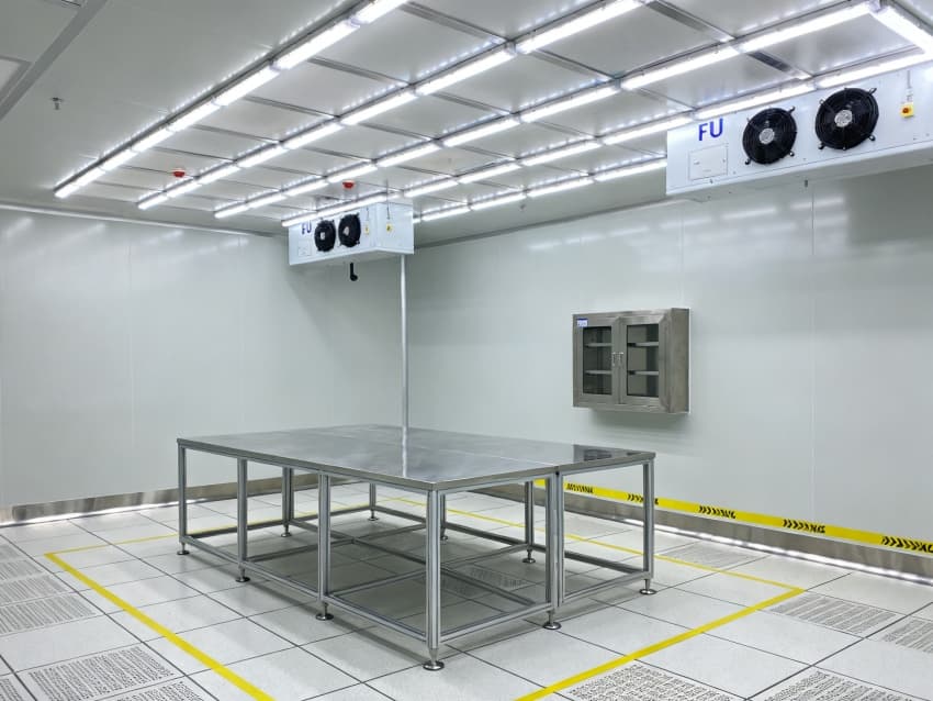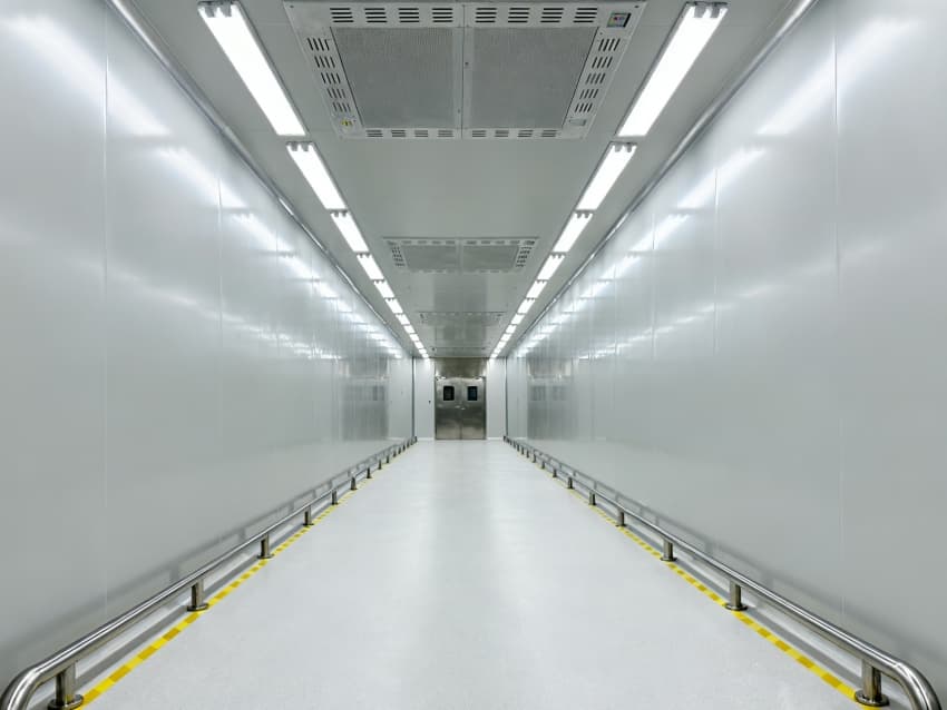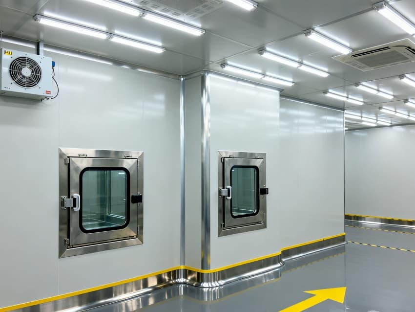 内部按芯片工艺流程划分光刻辅助区、晶圆预处理区、封装过渡区等,各区域通过无尘传递舱衔接。车间严格执行万级洁净标准(ISO8级),每立方米空气中≥0.5μm微粒数≤352000个,采用初效-中效-高效-化学过滤四级净化系统,配合垂直层流送风,每小时空气置换25-30次。墙面为防静电不锈钢板,地面是环氧树脂自流平材质,温度稳定在23±1℃、湿度45±3%RH,同时配备静电消除装置,避免微粒与静电影响芯片良率,完全契合芯片生产严苛要求。