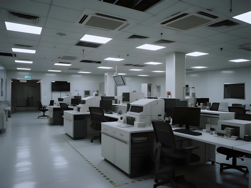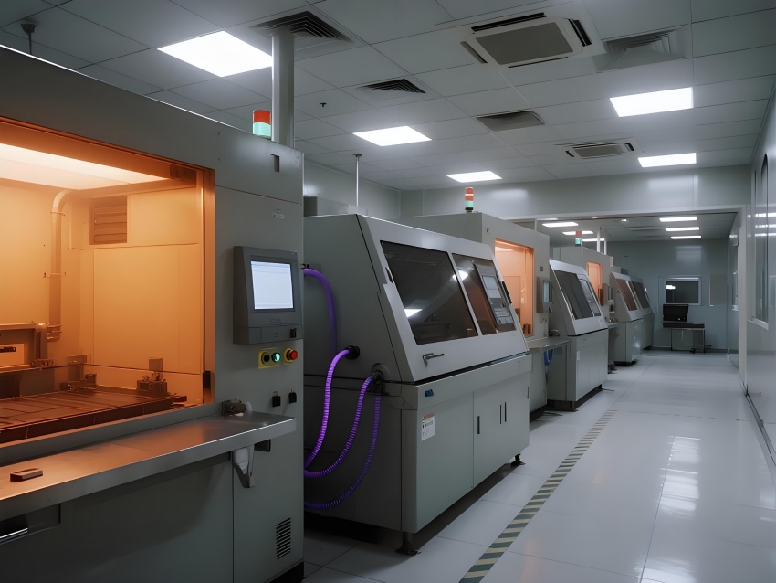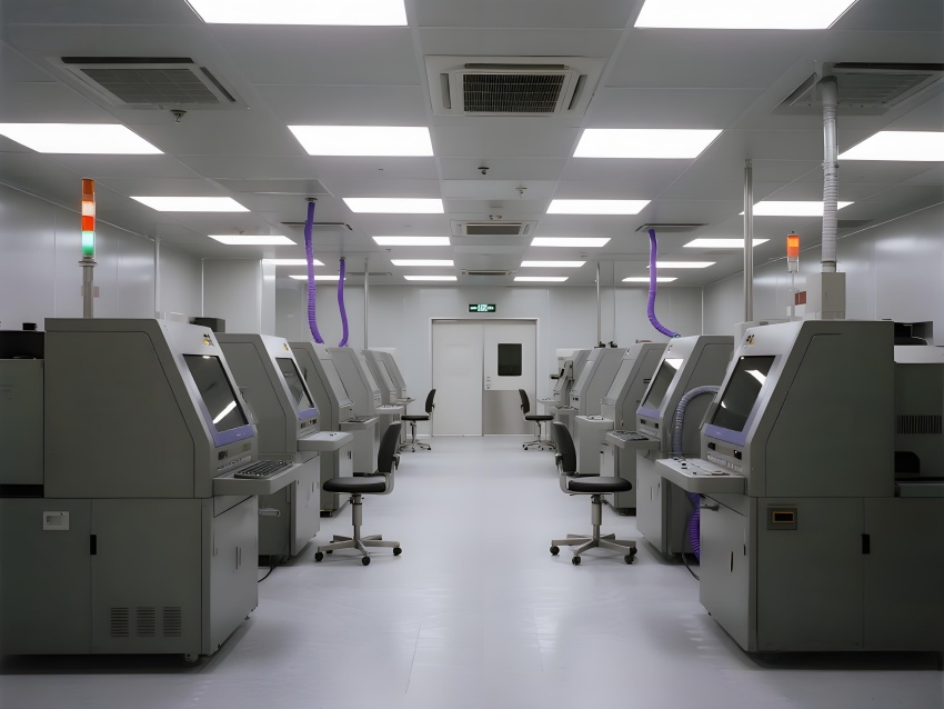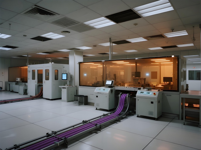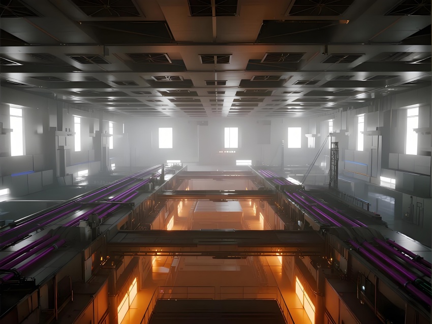 本芯片厂采用"硅基未来主义"设计风格,将纳米级制造的精密感转化为宏大的工业美学。空间以钛银与深空灰为主色调,光刻区的琥珀色防雾照明与蚀刻区的冷紫工艺气体管道形成科技光谱。高架地板下的蓝色气流指示灯模拟集成电路纹路,天花板的矩阵式FFU单元如晶圆阵列般规整。透明设备舱内机械臂的精准运动轨迹,与墙面悬浮的晶圆生产数据流构成动态叙事。防静电涂层的金属质感表面反射出洁净室的无限纵深感,关键区的红色激光定位光幕则强化半导体制造的危险与精确。通过严格的功能色彩编码(黄-光刻/紫-蚀刻/蓝-检测)和极简的无缝设计,在满足ISO14644Class1标准的同时,塑造出如同微观芯片放大至建筑尺度的震撼视觉隐喻。