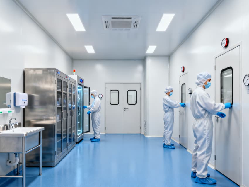 本体外诊断试剂生产厂房统一采用蓝色抗菌洁净地坪与白色无缝抗菌墙面,适配试剂研发、生产、检验全流程,各车间洁净度等级及净化系统参数精准匹配工艺需求。蓝色地面具备耐化学腐蚀、易消杀特性,白色墙面减少粉尘吸附,为净化系统高效运行奠定基础。
