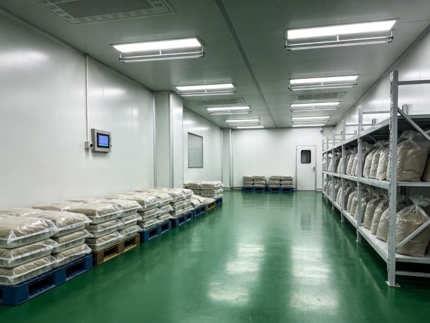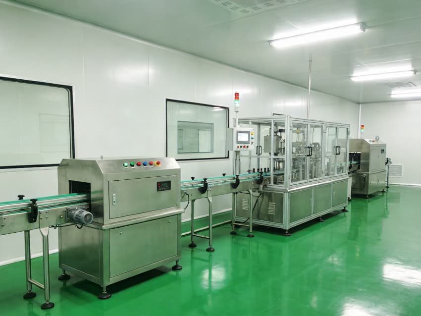 整体空间采用医药级洁净围护体系:墙面与顶板选用抗菌型洁净彩钢板,搭配圆弧角收边与密封胶条,彻底消除积尘死角;地面为绿色防静电环氧自流平材质,表面光滑耐磨、易清洁消毒,同时具备静电消散功能,避免静电对药品的潜在影响。吊顶集成 FFU 风机过滤单元与恒温恒湿控制系统,可稳定维持十万级洁净度与 18-26℃的工艺环境,通过压差管控保障各区域空气单向流动,有效防止交叉污染。
