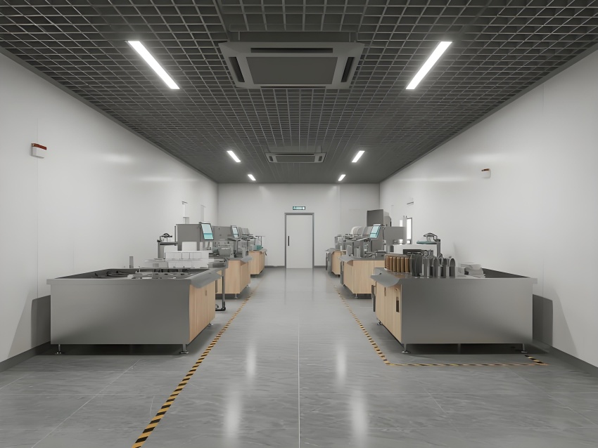 地面采用深灰色环氧防滑地坪,耐磨抗压且易清洁;墙面使用白色抗污纳米涂层钢板,无缝拼接避免积灰;顶面设计为开放式黑色网格吊顶,裸露管线增强工业感,搭配高效LED条形灯带提供无影照明。