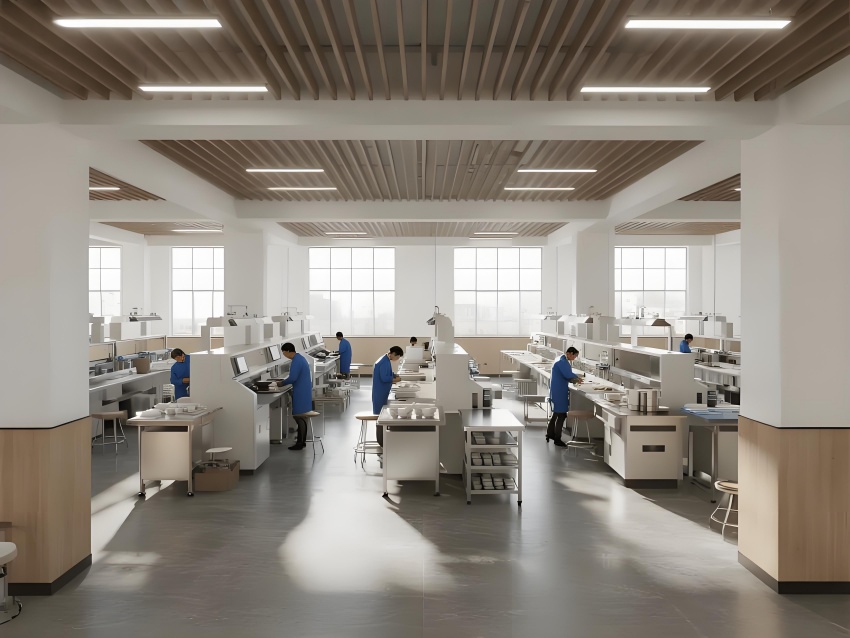 本餐具制品车间设计以现代简约工业风为核心,融合高效生产与视觉舒适性。色调以纯净白(墙面)、浅木色(仓储柜)和不锈钢银灰(设备)为主,营造清爽专业的氛围。