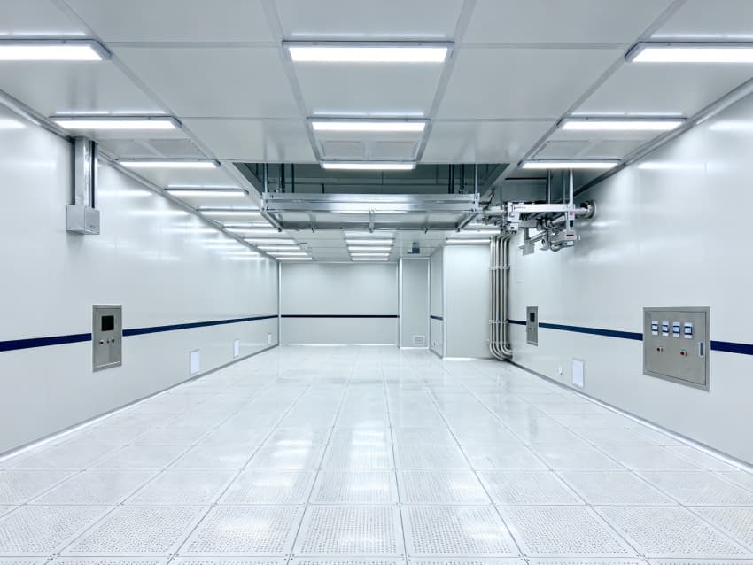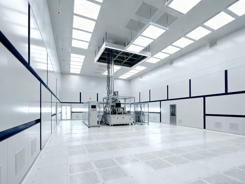 内部6个量子车间均为无设备空旷布局,按千级洁净标准与防电磁干扰要求建设:地面铺设防静电环氧自流平,墙面采用无磁不锈钢洁净板,阴阳角做R50圆弧处理;柱网间距设为8米,预留充足设备安装与运维空间;顶部整合恒温恒湿系统、高效送风口及防眩光LED照明,设备管线暗藏设计,进一步强化空间空旷感,为量子芯片测试、量子传感研发等场景提供稳定、洁净的专属环境。