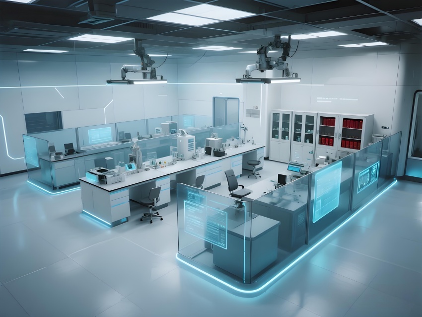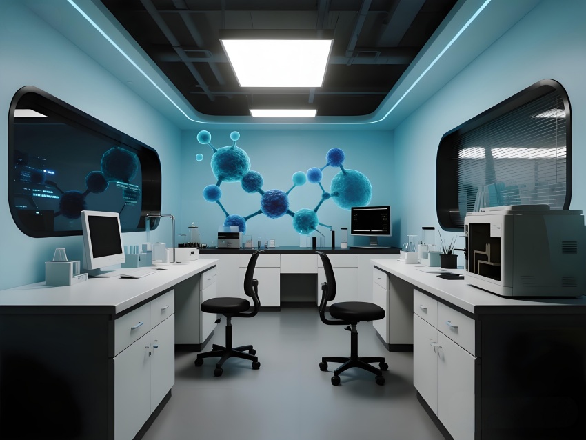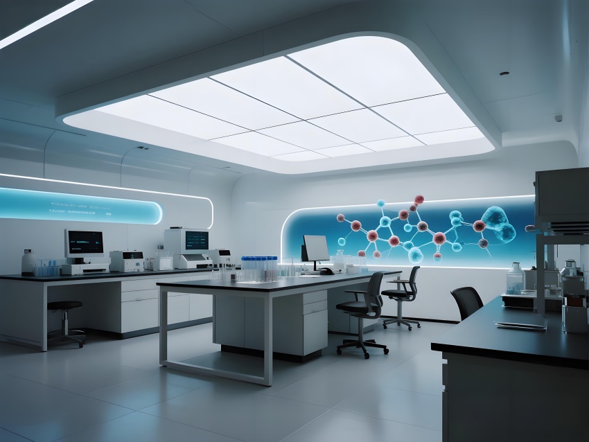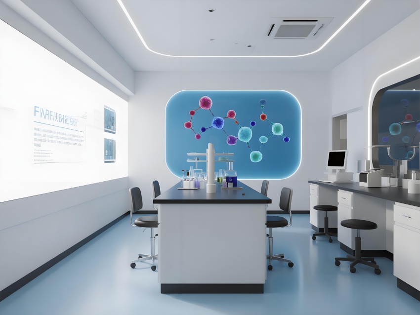 本设计以"科技赋能生命"为核心理念,构建纯净高效的研发环境。主体采用冰川白与医用蓝的渐变配色,墙面嵌入动态生物分子结构LED装饰,营造科研仪式感。实验区采用模块化悬浮工作台,透明智能玻璃隔断实现空间通透性与功能分区的完美平衡。顶棚的流线型送风系统与地面荧光导视带形成立体动线指引。核心无菌区采用圆形穹顶设计,搭配全息投影灭菌提示界面。数据分析中心配备曲面智能白板墙,实时可视化研究数据。危化品存储区通过红色光晕警示与物理隔离确保安全。整体空间融合医疗级洁净美学与科幻实验室语言,在严谨中注入未来感,通过智能交互界面与人性化灯光系统,打造国际一流水准的医药研发矩阵空间。