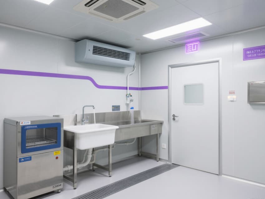 空间配备嵌入式LED洁净灯(照度≥400lux)、恒温恒湿控制系统(温度22±1℃,湿度50±3%),不锈钢洁净门窗采用高气密性密封结构。实验区预留高精度仪器接口与防静电接地端子,紫色气流流线标识引导操作动线,全方位保障精密实验的准确性与稳定性。