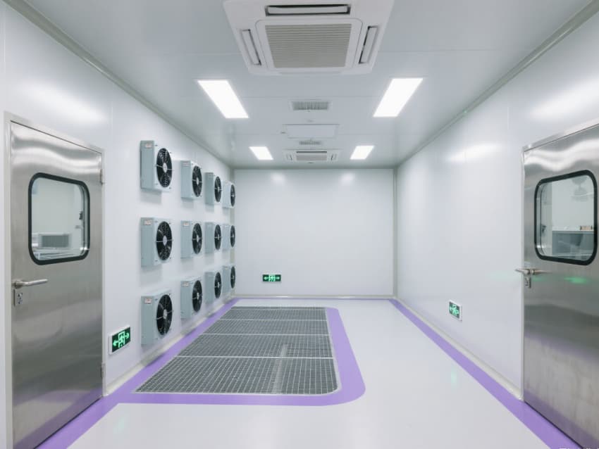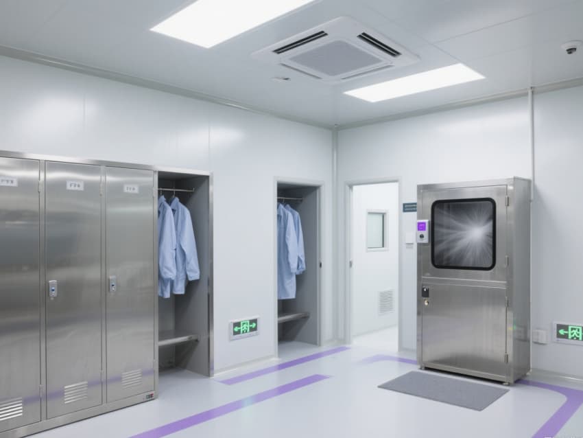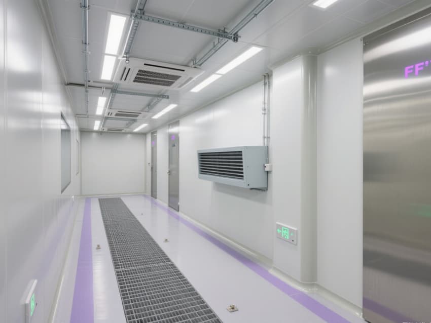 实验室以银白色抗菌金属彩钢板构建墙体与吊顶,搭配浅灰色防静电环氧地坪,金属质感与冷色调结合,既强化洁净氛围,又具备抗腐蚀、易消毒特性。墙面与地面的圆弧过渡设计消除积尘死角,顶部密布的FFU风机过滤单元形成垂直层流,配合侧下回风系统,实现每小时25-30次空气置换,持续维持室内正压。?
