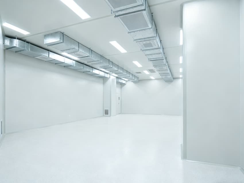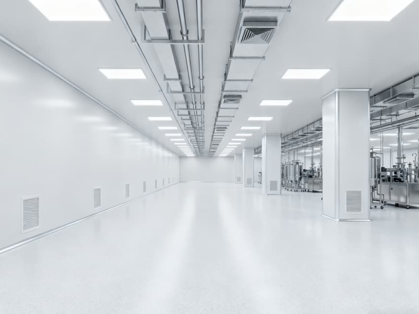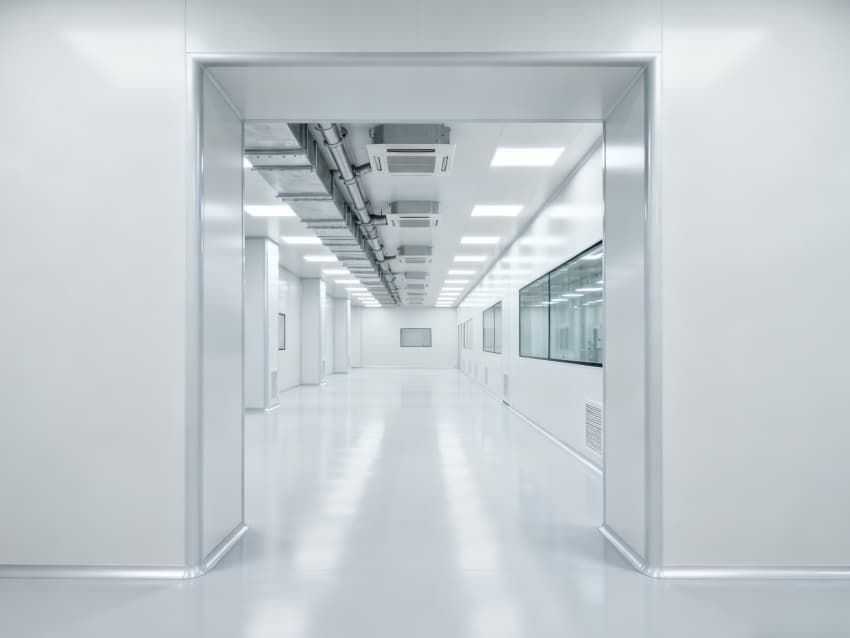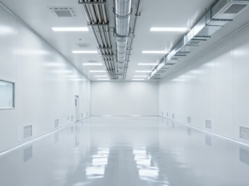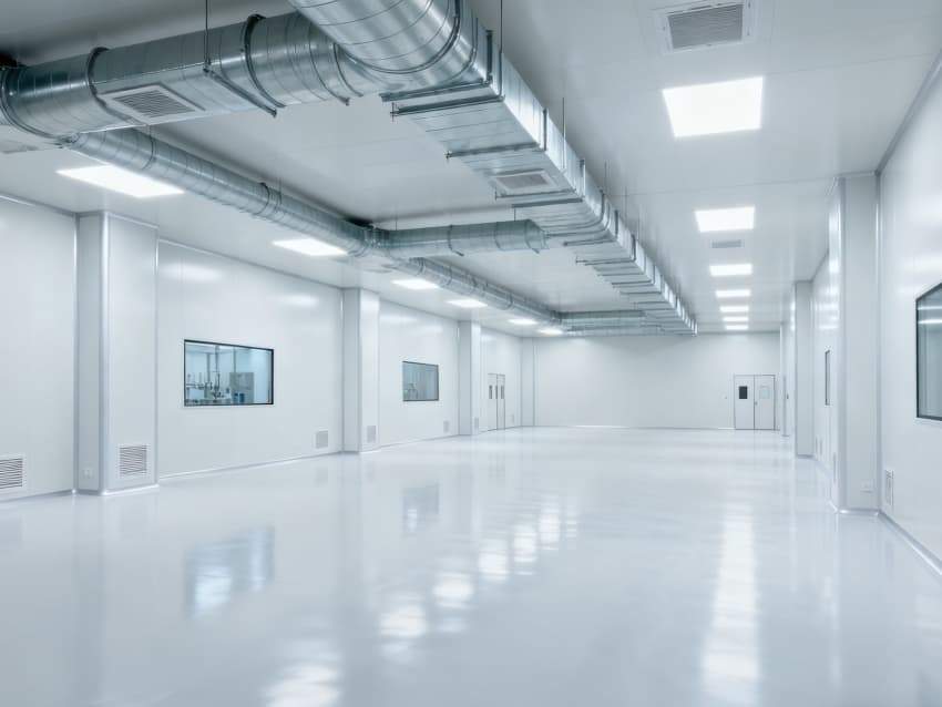 内部6个核心生产车间均为无设备空旷布局,按万级洁净标准打造:地面铺设无缝环氧自流平,墙面采用食品级不锈钢墙板,阴阳角做圆弧处理,杜绝积尘死角;空间柱网间距均匀,预留充足设备安装点位与运维通道,满足后续柔性生产需求;顶部吊顶整合新风系统与防眩光照明??椋缈诓季侄猿乒嬲?,进一步强化空间的空旷感与规整性,为生物制药生产的洁净性、安全性与可扩展性奠定坚实基础。
