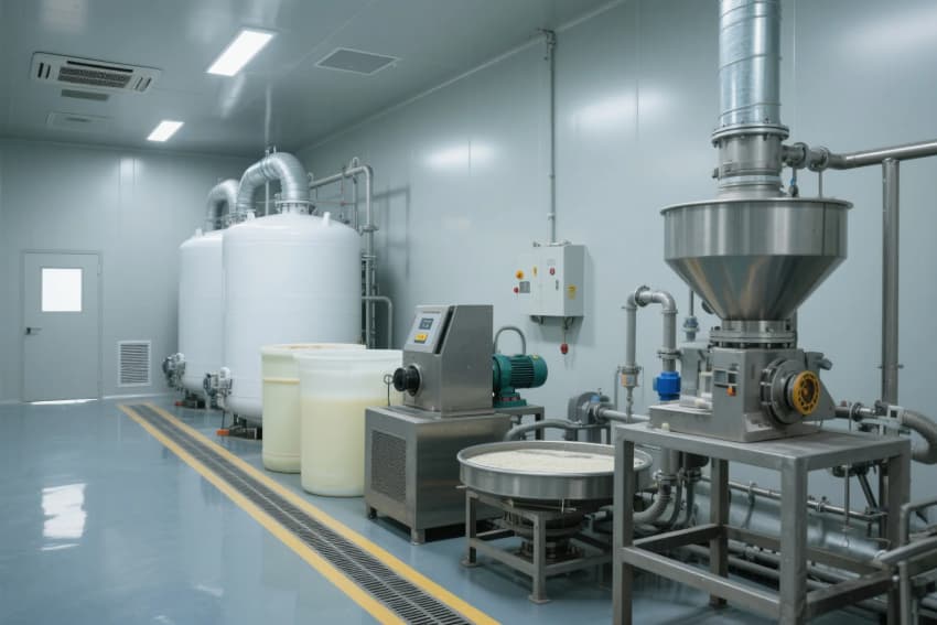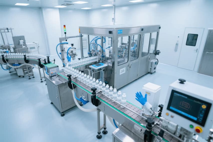 该药剂生产车间严格遵循GMP(药品生产质量管理规范)标准建设。车间以白色为主色调,搭配蓝色标识系统,营造出洁净、规范的生产环境。墙面、地面采用无缝抗菌材质,便