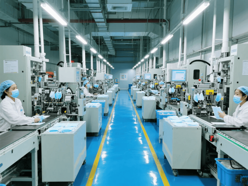 本方案采用"医疗工业极简风",符合YY/T0969-2013口罩行业标准。车间按功能分区: 原料区(熔喷布恒温储存23±2℃) 生产区(超声波焊接噪音<75dB) 灭菌