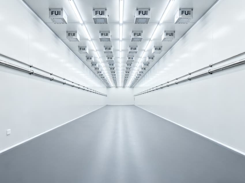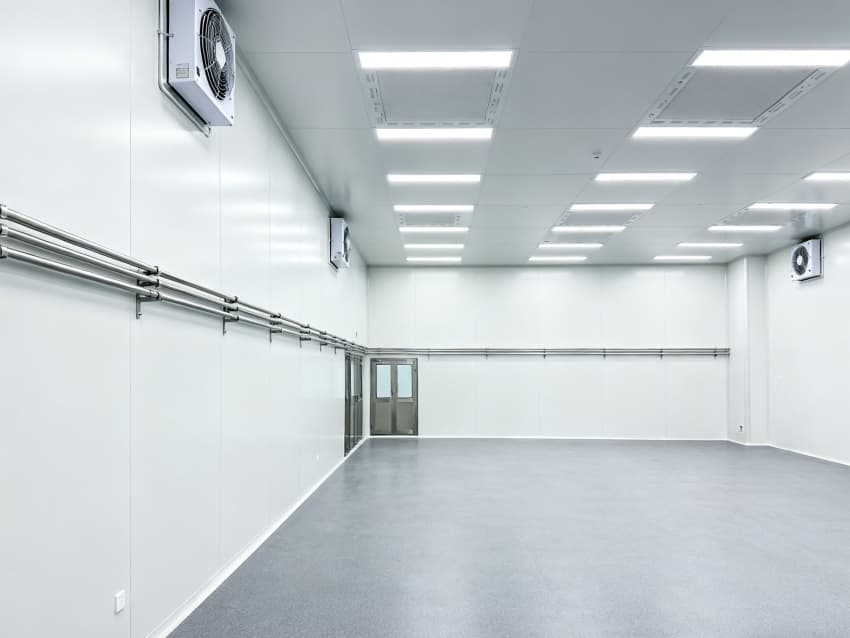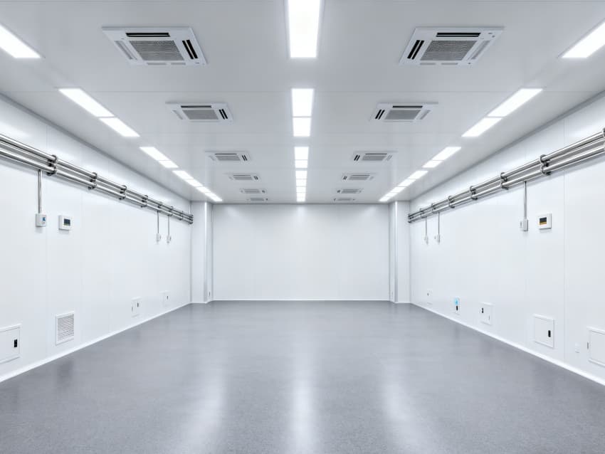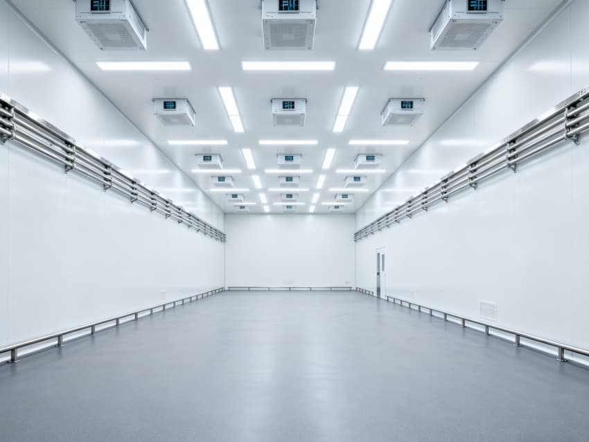 内部6个生产车间均为无设备空旷布局,按百级洁净标准建设:地面铺设防静电环氧自流平,墙面采用无颗粒洁净彩钢板,阴阳角做R30圆弧处理杜绝积尘;柱网间距设为9米,预留光刻机、晶圆检测设备等重型设备安装点位;顶部整合恒温恒湿系统、高效空气过滤器及防频闪LED照明,所有管线暗藏于吊顶内,最大化释放空间高度,为芯片晶圆制造、封装测试等核心环节提供超洁净、高稳定的专属生产环境。