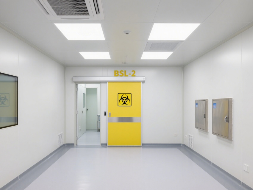 该病原生物检测实验室是符合BSL-2级生物安全标准的专业检测场所。实验室采用严格的分区设计,以黄色生物危害标识明确核心检测区域,配备负压系统(负压15Pa),通过高效空气过滤与气流控制,防止病原微生物扩散。