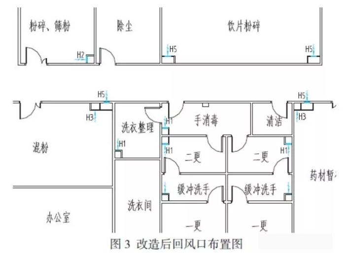 根据生产工艺及正压要求,不同正压值要求房间分设回风柱,各在回风口或回风管接阀门进行调节,回风口设过滤网。另外,饮片粉碎、混粉等污染洁净间,在靠近污染工艺设备处设排风口,及时把产生的污染空气排出洁净室外。改造后经调试,洁净区与普通区压差+10Pa,洁净走廊与混粉等污染房间压差+5Pa,测试正压值和洁净度一次通过,运行近两年也没出现问题。