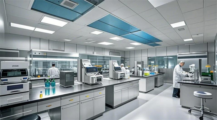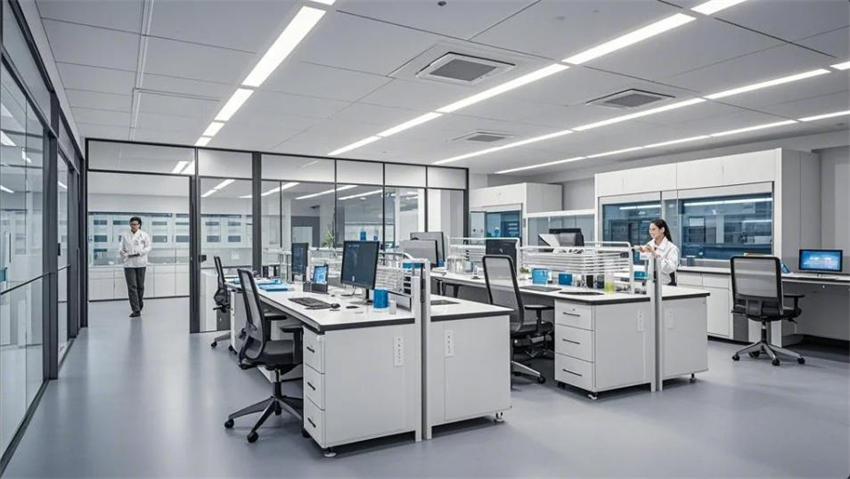 1000平方米生物实验室整体装修,现代科技风格,实验室分为核心实验区、设备区、样品存储区和办公区。核心实验区占50%,设备区占30%,样品存储区占10%,办公区占10%。核心实验区:防静电环氧地坪(浅灰色),白色彩钢板墙面和天花板,顶部高效过滤器(HEPA),不锈钢实验台,设备排列整齐。设备区:精密仪器整齐排列,地面为防静电PVC地板(浅色)。样品存储区:冷藏柜和样品架整齐,温湿度控制。办公区:玻璃隔断,现代简约办公桌。整体色彩:白色、浅灰色、科技蓝点缀。