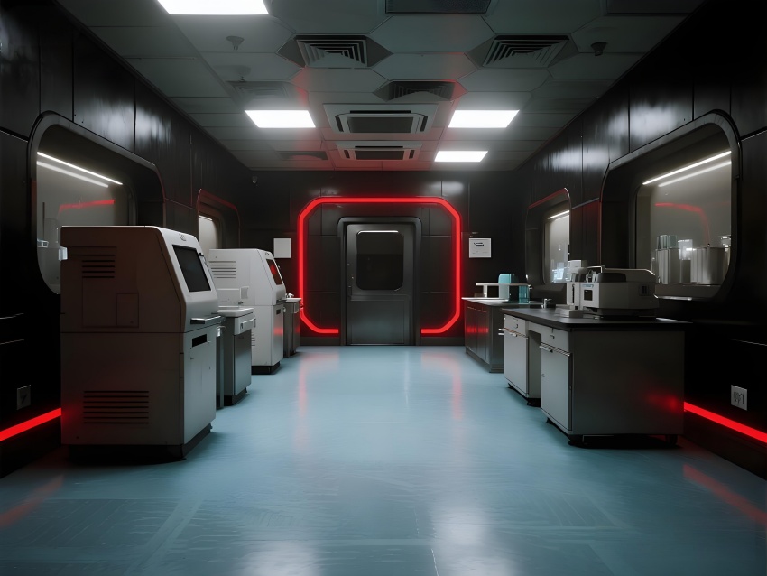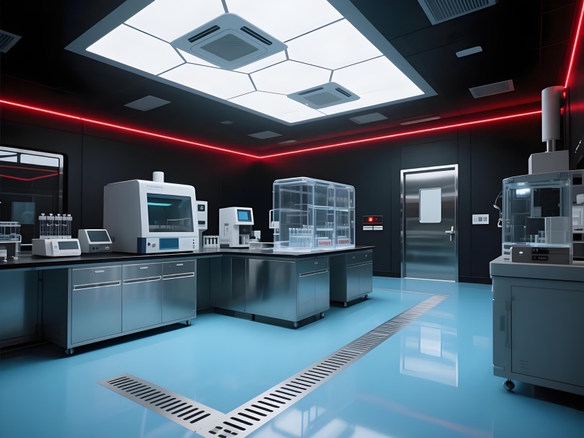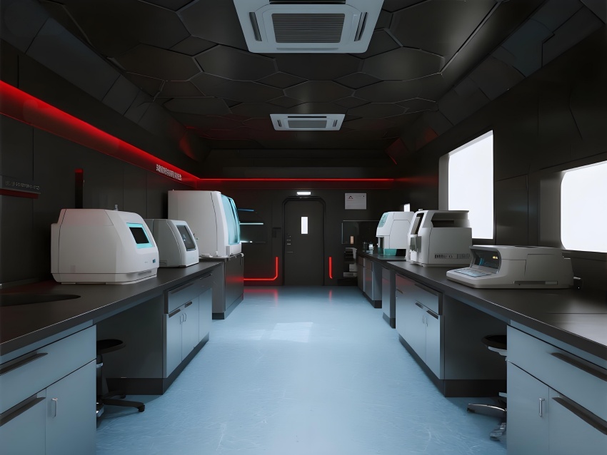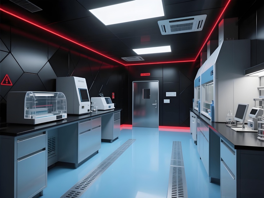 本实验室采用"生物防御未来主义"风格,通过锐利的几何切割与警示色彩构建科研防护美学。核心实验区以哑光黑墙面搭配红色应急光带,形成视觉危险预警,与清洁区的冰蓝色环氧树脂地面构成强烈功能区分。设备区的金属原色与透明PCR仪散热孔展现工业精密感,天花板的六边形送风单元与地面导流孔形成垂直气流可视化。防爆玻璃观察窗嵌入电子压差显示屏,气闸室的黄色斜纹标识强化生物安全等级过渡。通过冷白光与设备界面蓝光的层叠照明,在满足BSL-2物理防护要求的同时,营造出科幻电影般的严谨科技氛围,传递基因工程特有的精密与危险并存的特质。