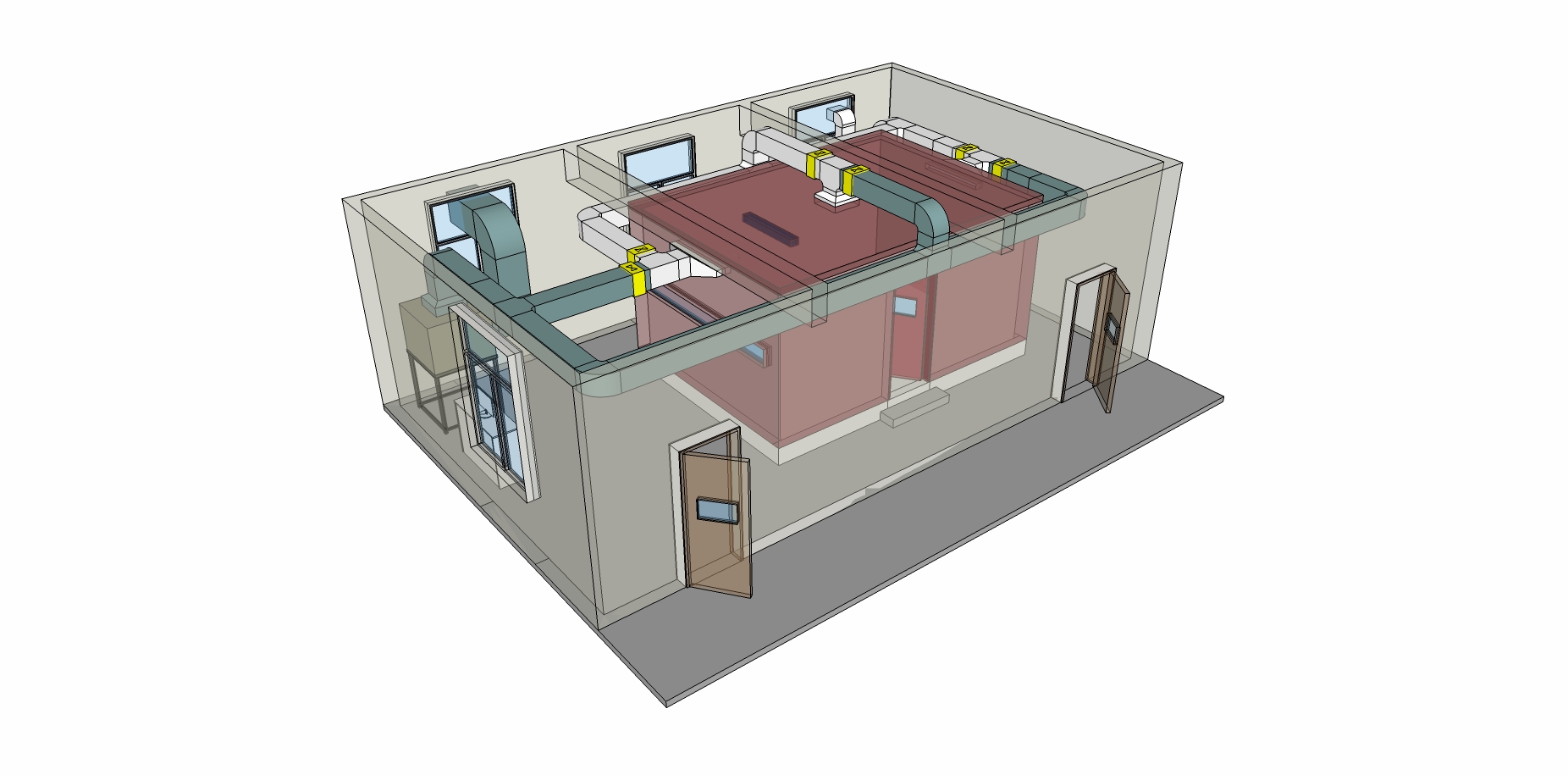 实验室分为外室和内室两部分。内室为主要的实验平台,放置呼吸暖体假人和VOAG,通过外室的空调系统、恒温恒湿系统向内室送入恒定温度和湿度均匀的新风,提供恒定的温湿环境,整套系统采用全进全排的方式,不回风。外室放置空调机组、恒温恒湿机柜。