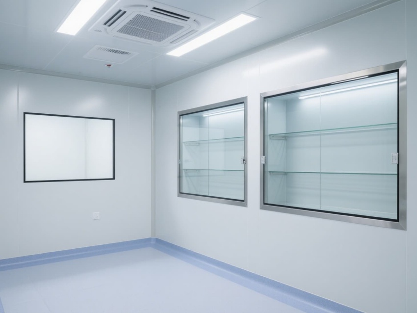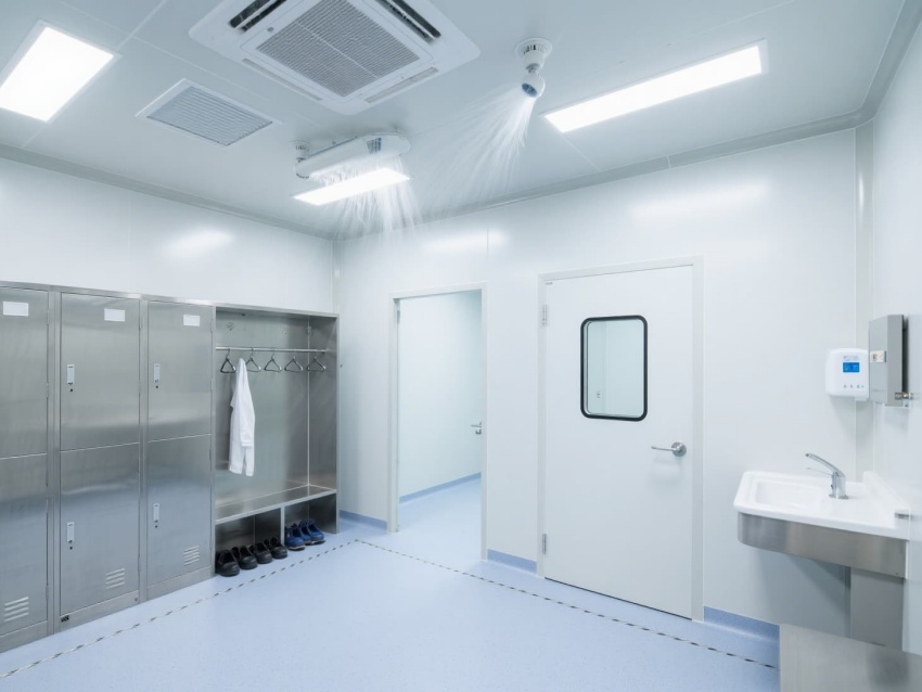 实验室以白色抗菌彩钢板构建墙体与吊顶,搭配浅蓝灰色防静电环氧地坪,整体色调简洁明快。墙面与地面的圆弧角设计避免积尘,便于高频次消毒清洁。顶部高效过滤器形成单向流气流,每小时15-20次空气置换,维持室内正压以防外界污染。?