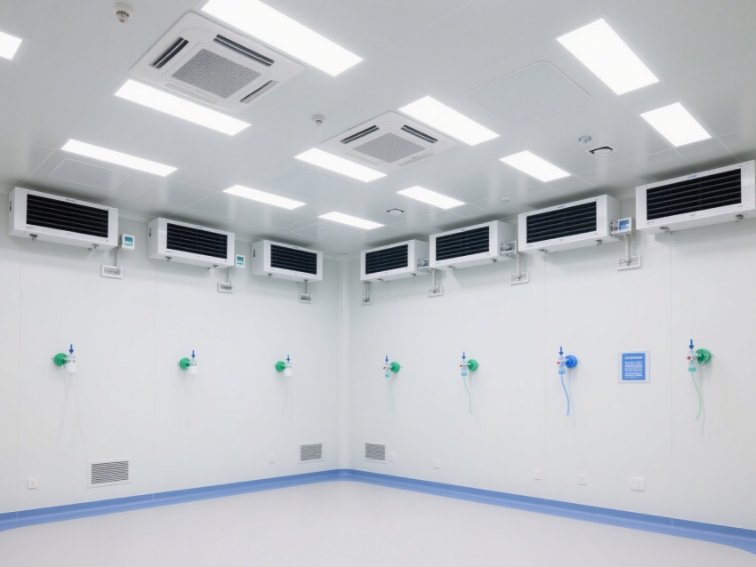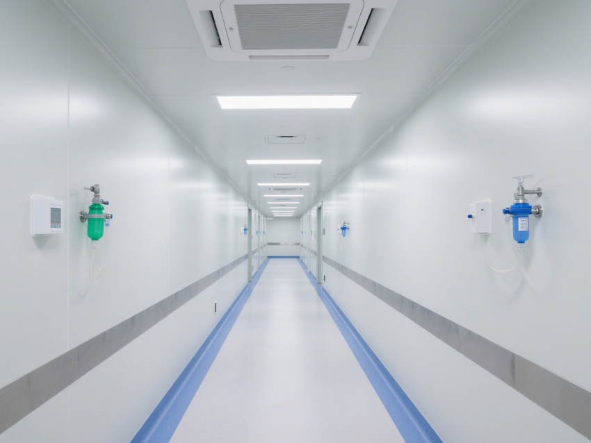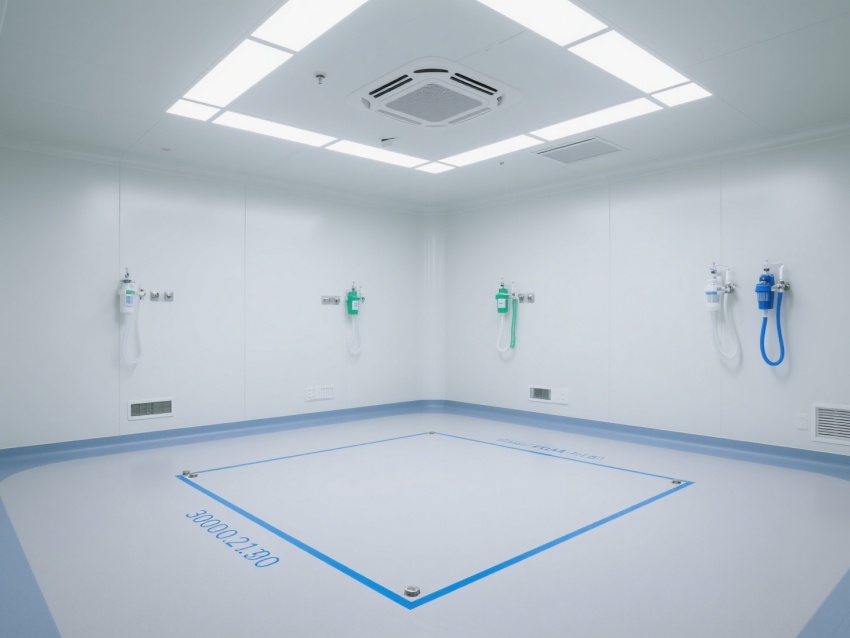 该医疗无尘室是为医疗诊疗与精密操作打造的专业洁净空间。室内以白色为主调,搭配蓝色标识系统,墙面、地面采用无缝抗菌材质,便于清洁消毒,有效防止微生物与灰尘污染。